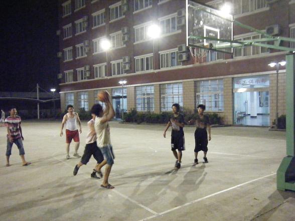 爱好体育的员工晚上没事可到灯光球场比拼一下