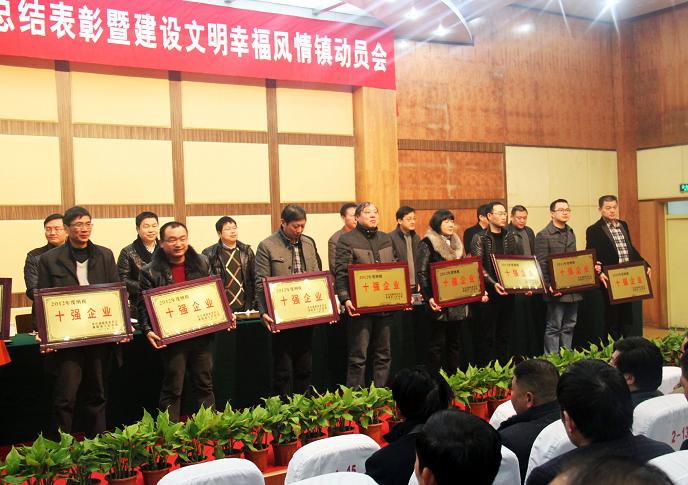 二月十八日,浦阳镇召开2012年度先进表彰大会,我公司董事长兼总经理孙锦龙,常务副总经理吴益民,生产副总蒋忠灿和总经理助理丁关根参加了大会。因公司在2012年度中的优异成绩,孙总上台接受了“创业功臣”和“五星级强企业”的奖牌;吴总上台接受了“先进党组织”的奖牌;蒋总上台接受了“纳税十强企业”的奖牌。